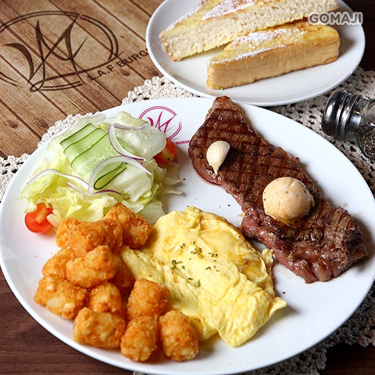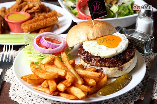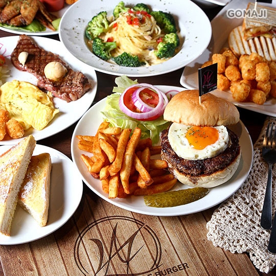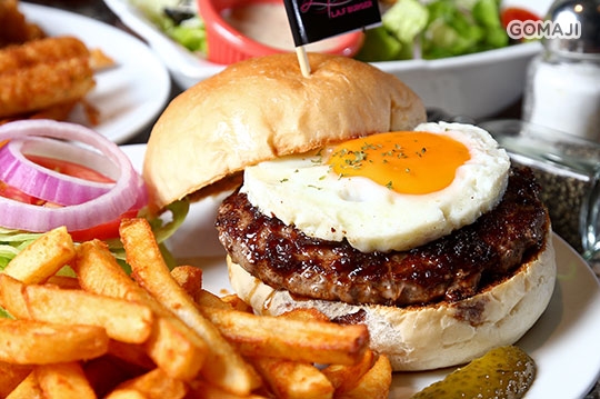 美式漢堡與日本文化的完美結合,麻吉非吃不可照燒太陽蛋牛肉堡!厚實的漢堡肉排淋上噴香誘人的照燒醬汁,上面搭配一顆太陽蛋,再以Q彈麵包上下包夾,新鮮蔬食和醃漬黃瓜當然是不可或缺的配角,最後再嚐嚐酥脆薯條,保證讓人心滿意足!