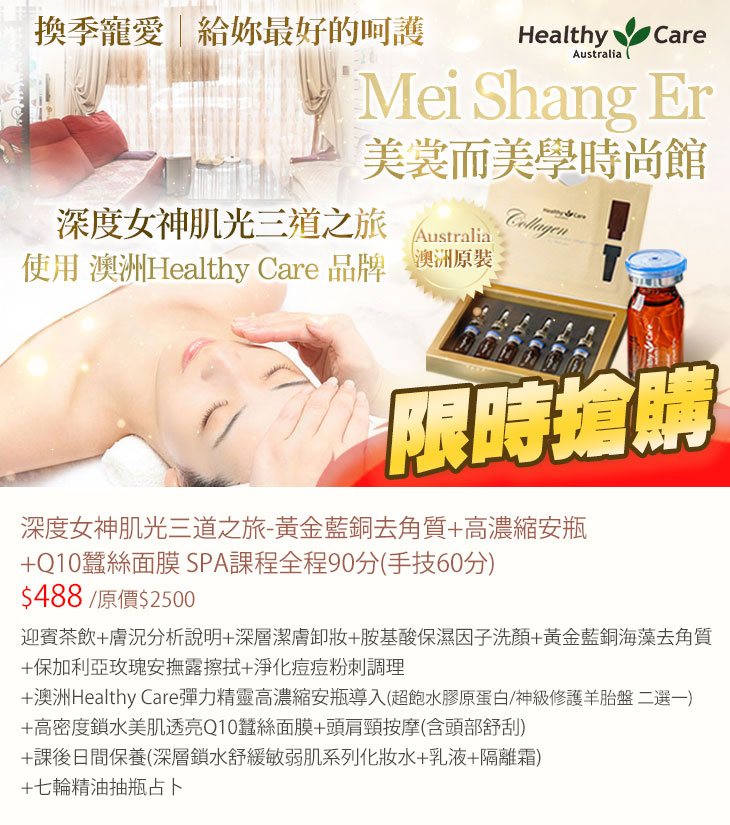 〈迎賓茶飲+膚況分析說明+深層潔膚卸妝+胺基酸保濕因子洗顏+黃金藍銅海藻去角質+保加利亞玫瑰安撫露擦拭+淨化痘痘粉刺調理+澳洲Healthy Care彈力精靈高濃縮安瓶導入(超飽水膠原蛋白/神級修護羊胎盤 二選一)+高密度鎖水美肌透亮Q10蠶絲面膜+頭肩頸按摩(含頭部舒刮)+課後日間保養(深層鎖水舒緩敏弱肌系列化妝水+乳液+隔離霜)+七輪精油抽瓶占卜〉