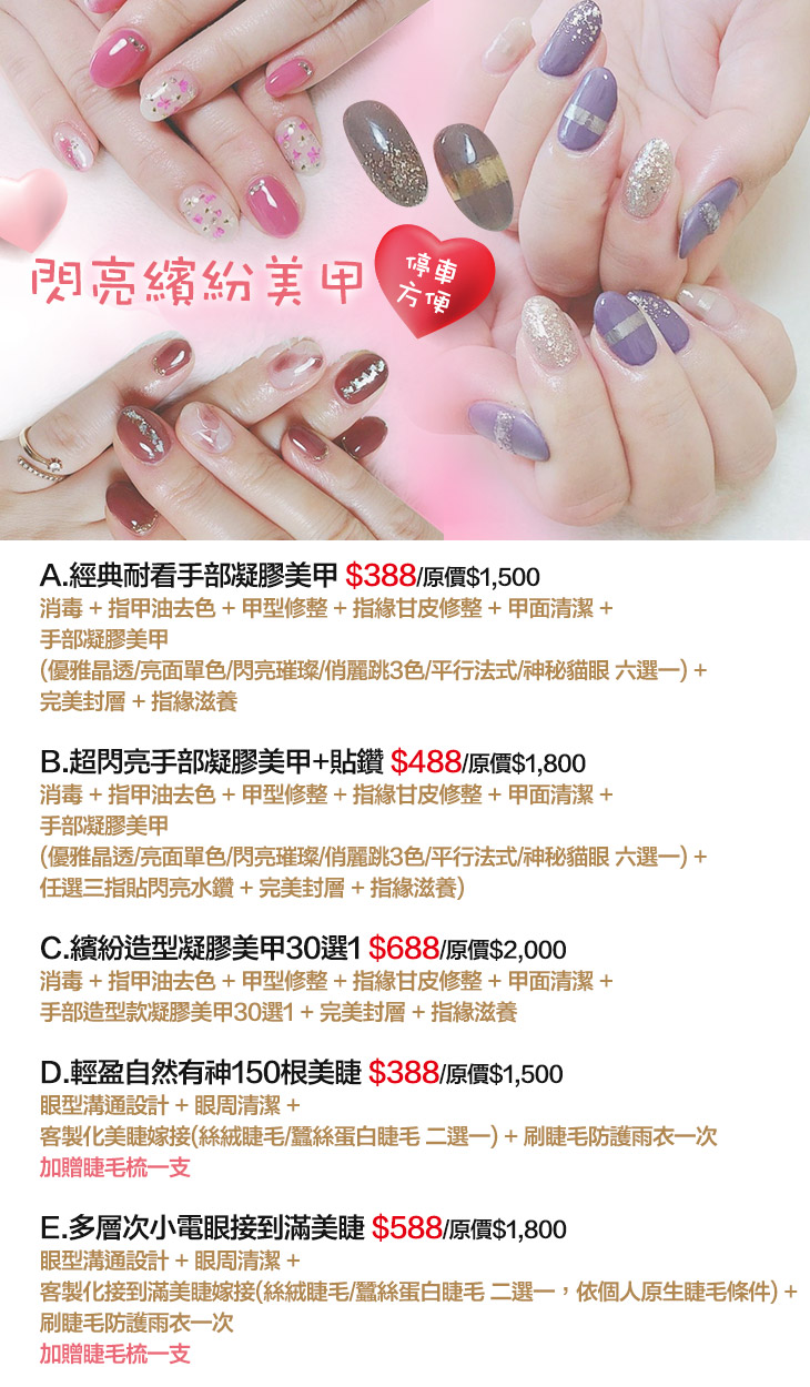A.經典耐看手部凝膠美甲 / B.超閃亮手部凝膠美甲+貼鑽 / C.繽紛造型凝膠美甲30選1 / D.輕盈自然有神150根美睫 / E.多層次小電眼接到滿美睫