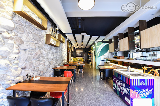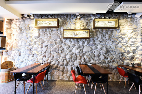 店家運用石材、玻璃與燈光營造出異國風情的感覺。在用餐的一側,牆壁上的石材,只有在海灘才看得到的材質。同時搭配室內燈光效果與門口落地窗引進的自然光,打造出一種另類的異國風情。有別一般的餐廳,給人清爽又高雅的的環境,使用的食材都很講究,為台南帶來一大福音!