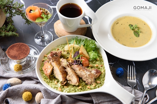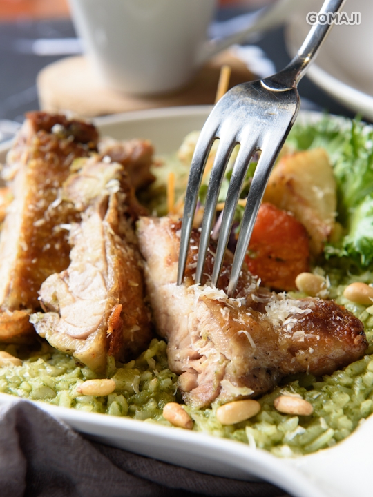 ★ 嫩煎本產跑山雞腿(法式青醬燉飯)