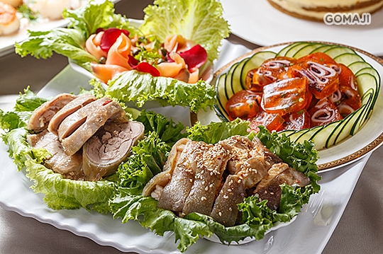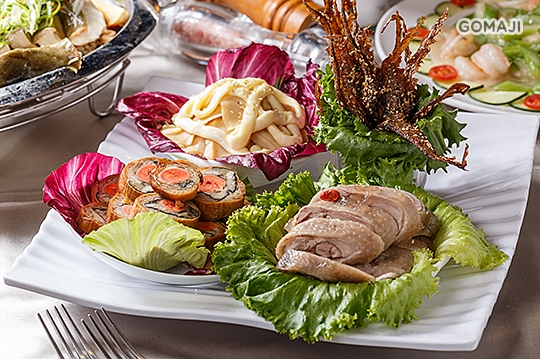 煙燻鮭魚 + 花枝凍 + 涼拌龍魚腹 + 醉雞腿