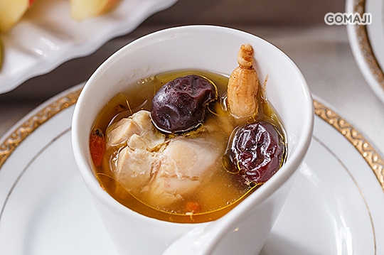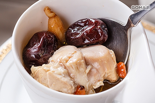 此道乃中國傳統經典藥膳配方,上品人蔘、黑棗、枸杞之黃金比例,再加入新鮮上選雞腿肉,經過長達四小時以上的細火慢熬,釋放食材各自的養分與氣味相融,即使無添加任何調味品,一樣美味可口!