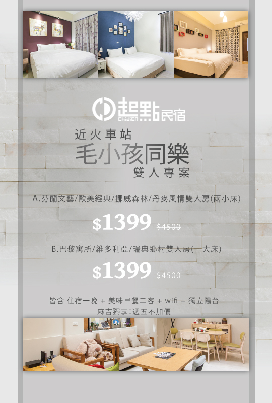 民宿房型體現了北歐的風情萬種,將設計嵌入旅途的芬蘭文藝房;充滿神秘感的紫色調性挪威森林房;人文情感濃厚的巴黎寓所房等,每房皆有42吋液晶電視,就在這裡展開快樂旅程的起點吧!