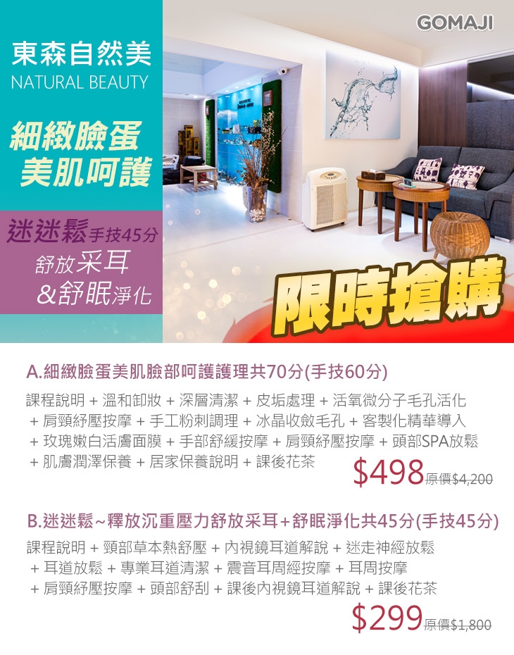 A.細緻臉蛋美肌臉部呵護護理共70分(手技60分) / B.迷迷鬆~釋放沉重壓力舒放采耳+舒眠淨化共45分(手技45分)