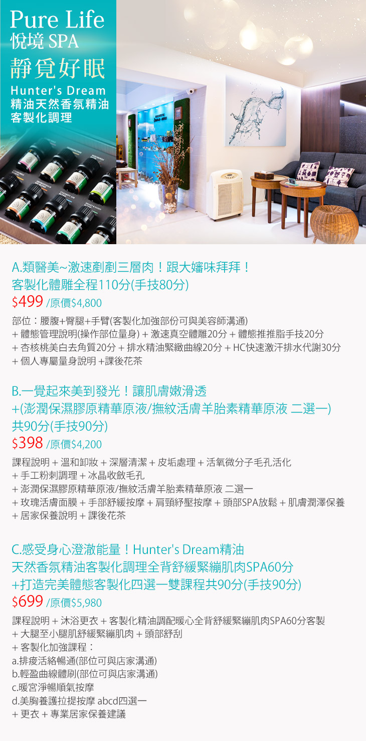 A.類醫美~激速剷剷三層肉!跟大嬸味拜拜!客製化體雕全程110分(手技80分) / B.一覺起來美到發光!讓肌膚嫩滑透+(澎潤保濕膠原精華原液/撫紋活膚羊胎素精華原液 二選一)共90分(手技90分) / C.感受身心澄澈能量!Hunter's Dream精油天然香氛精油客製化調理全背舒緩緊繃肌肉SPA60分+打造完美體態客製化四選一雙課程共90分(手技90分)