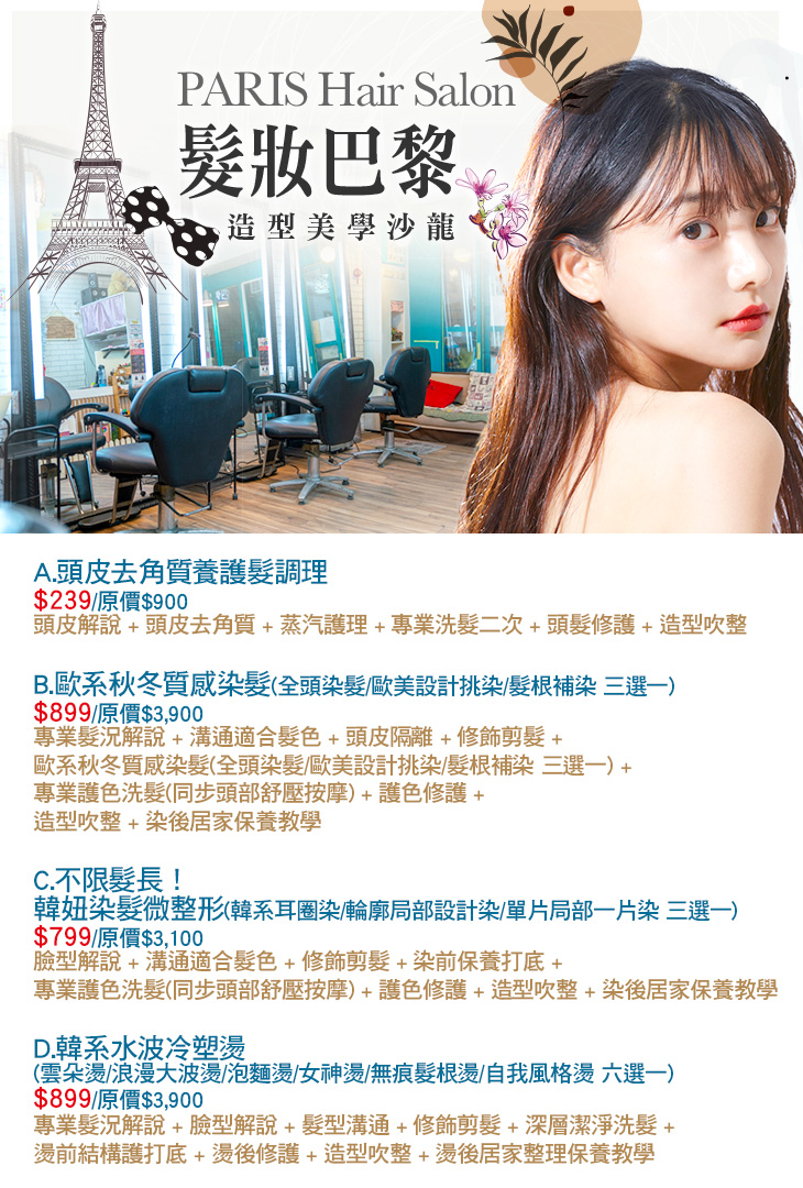 A.頭皮去角質養護髮調理 / B.歐系秋冬質感染髮(全頭染髮/歐美設計挑染/髮根補染 三選一) / C.不限髮長!韓妞染髮微整形(韓系耳圈染/輪廓局部設計染/單片局部一片染 三選一) / D.韓系水波冷塑燙(雲朵燙/浪漫大波燙/泡麵燙/女神燙/無痕髮根燙/自我風格燙 六選一)