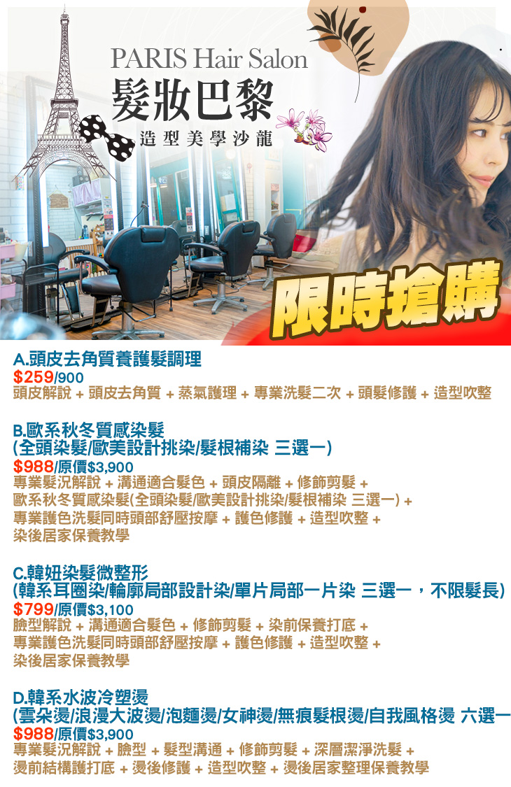 A.頭皮去角質養護髮調理 / B.歐系秋冬質感染髮(全頭染髮/歐美設計挑染/髮根補染 三選一) / C.韓妞染髮微整形(韓系耳圈染/輪廓局部設計染/單片局部一片染 三選一,不限髮長) / D.韓系水波冷塑燙(雲朵燙/浪漫大波燙/泡麵燙/女神燙/無痕髮根燙/自我風格燙 六選一)