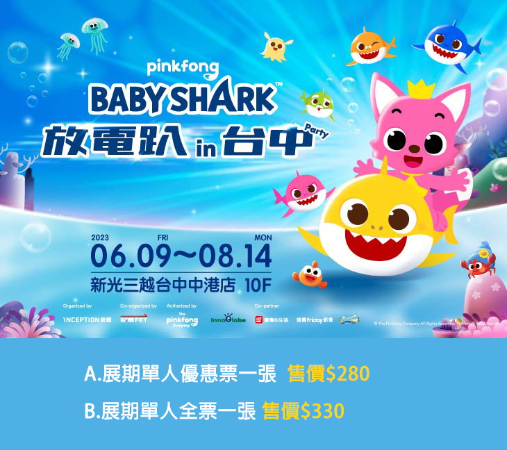 全世界都擋不住的魅力,只要聽一次就會唱,前奏一下就會跳,輕快的旋律搭配簡單的手勢,讓你想忘也忘不掉,兒童界超人氣巨星鯊魚寶寶即將在新光三越台中中港店,邀請大小朋友來到海底世界一起開派對囉~