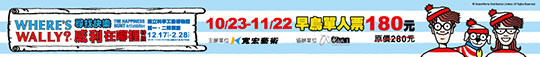 《威利在哪裡?》被譽為「尋寶遊戲圖畫書」的開山之作,自1987年出版即風靡全球,掀起全世界的「尋找威利」狂熱旋風,至今已售出38個國家版權,被翻譯超過30種語言版本,全球暢銷超過6000萬冊。更是各國地標、知名設計師、流行商品競相合作的流行指標!《尋找快樂 威利在哪裡?特展》台北展出後,讓北台灣陷入尋找威利的熱潮,今年12月17日起移師高雄國立科學工藝博物館,南台灣將再度旋起一股尋找威利狂熱! 早鳥單人票一張180元!