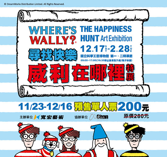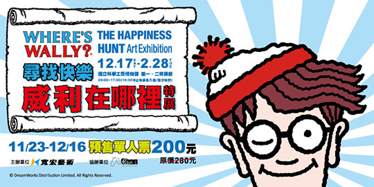 《威利在哪裡?》被譽為「尋寶遊戲圖畫書」的開山之作,自1987年出版即風靡全球,掀起全世界的「尋找威利」狂熱旋風,至今已售出38個國家版權,被翻譯超過30種語言版本,全球暢銷超過6000萬冊。更是各國地標、知名設計師、流行商品競相合作的流行指標!《尋找快樂 威利在哪裡?特展》台北展出後,讓北台灣陷入尋找威利的熱潮,今年12月17日起移師高雄國立科學工藝博物館,南台灣將再度旋起一股尋找威利狂熱! 預售單人票一張200元!