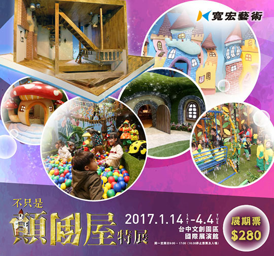 展覽動手玩,探訪不可思議童話奇境!《顛倒屋特展》於2015年台北展出、2016年移師高雄,展覽好評如潮,2017年寒假席捲台中!【不只是顛倒屋特展】獨家打造六大主題:倒立顛倒屋、變形哈哈屋、歡樂遊趣樹屋、可愛蘑菇屋與神祕小矮人屋,以及繽紛糖果屋概念販售部,結合玩樂、體驗與藝術,透過親自動手、動腦,提供大小朋友探索未知領域的機會,大膽玩樂從中學習,激發無限想像力!展期單人票一張280元!