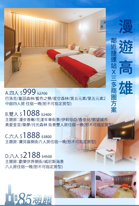 【高雄 85 涵館】座落於高雄苓雅區的《高雄 85 涵館》,擁有鄰近高雄捷運三多商圈站的交通優勢,不論前往大高雄各地皆十分方便,步行即可到達真愛碼頭、新光碼頭、大遠百等地區,為一處具有交通往來便利、生活機能佳等優質居住環境,是您往來南台灣旅行、出差、長住等超值的住宿選擇。