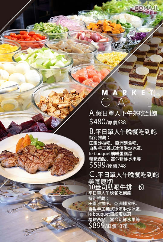MARKET CAFÉ 座落於天母精華地區,提供客人休閒健康的用餐體驗。堅持採用當季最新鮮的產地直送食材,堅守不含味精、不添加食用色素、不含人工添加物、不添加人工香料的 FOOD DNA。用餐客人可直接欣賞廚師以俐落手法,依照個人需求提供客製化烹飪美食。MARKET CAFÉ 的食材來自產地、菜園、市集天天直送的新鮮食材,以及富有國家標誌識別標章的優質食材,為消費者的健康飲食嚴格把關,呈現一道道安全、衛生的健康美食。