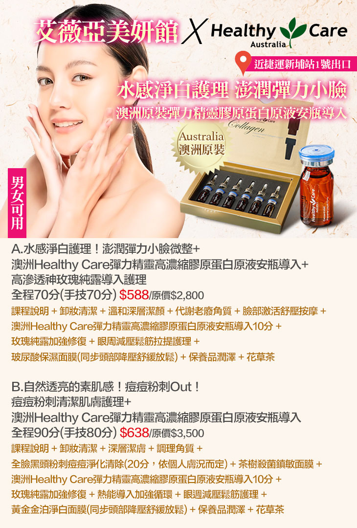 A.水感淨白護理!澎潤彈力小臉微整+澳洲Healthy Care彈力精靈高濃縮膠原蛋白原液安瓶導入+高滲透神玫瑰純露導入護理全程70分(手技70分) / B.自然透亮的素肌感!痘痘粉刺Out!痘痘粉刺清潔肌膚護理+澳洲Healthy Care彈力精靈高濃縮膠原蛋白原液安瓶導入全程90分(手技80分)