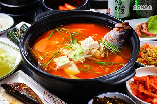 直竄喉底的溫熱辣魚湯,紅通通的色澤飽滿艷麗,不俗氣地喚醒人們渴望已久的挑剔味蕾。料理源於韓國,一尾活魚大剌剌橫躺在鍋中,明顯可見長度幾乎快超過整鍋的直徑,搭配豐富的正統用料,熱騰騰的端上桌,好振奮你我飢腸轆轆的心!