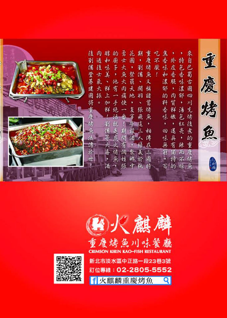 店主人待過大陸重慶餐飲界數年後,每每回到台灣總是吃不到正宗道地的川辣口味,並興起「將正宗四川麻辣分享給台灣朋友們」的念頭,因此在淡水沿海近老街、紅毛城、漁人碼頭之處創立了-【火麒麟重慶烤魚川味餐廳】!