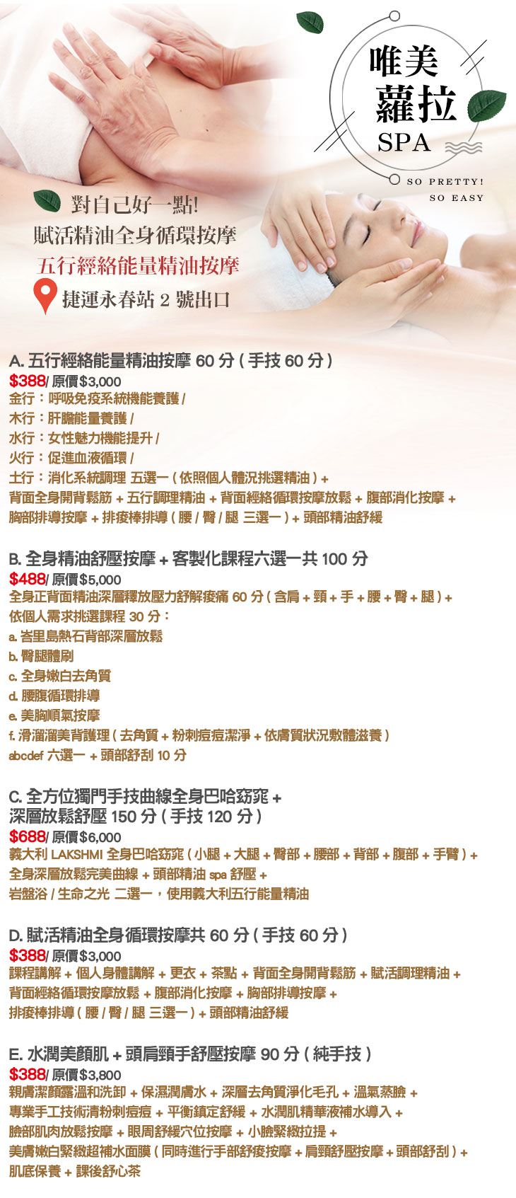 A.五行經絡能量精油按摩60分(手技60分) / B.全身精油舒壓按摩+客製化課程六選一共100分 / C.全方位獨門手技曲線全身巴哈窈窕+深層放鬆舒壓150分(手技120分) / D.賦活精油全身循環按摩共60分(手技60分) / E.水潤美顏肌+頭肩頸手舒壓按摩90分(純手技)
