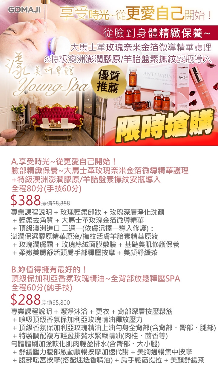 【漾 Young spa 美妍會館(黎明會館)】感謝麻吉們熱烈搶購,已全數賣光光。