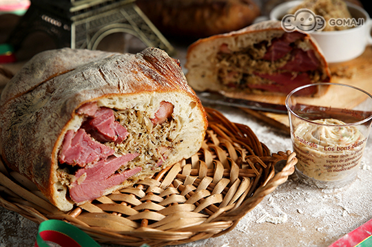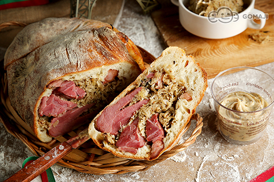萊茵河豬蹄-德國豬腳酸菜麵包畫龍點睛的重量級明星-德國豬腳,利用最滿意的配料-德國酸菜和國王明星商品芥末醬調和,豬腳剖開後塞入特調德國酸菜,先行放入烤爐20分鐘讓味道融合,緊接著再搭配麵糰包覆,放置烤爐烘烤30分鐘,香味四溢的美人蹄麵包便大功告成!
