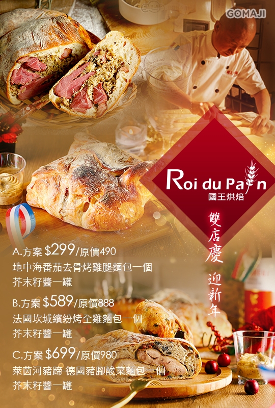 GOMAJI平台上有史以來賣最快的法國麵包,創下一週內一萬份完售,相信麻吉也經歷過【國王烘焙】的麵包旋風!這回推出雙店慶迎新年超值美味方案,烘焙大師徐國斌師傅一次送上三樣秘密武器,地中海番茄去骨烤雞腿麵包、法國坎城繽紛烤全雞麵包、萊茵河豬蹄-德國豬腳酸菜麵包,竟然驚喜的吃到真材實料的去骨雞腿、黃金雞、德國豬腳,限時優惠只要299元起,非buy不可!