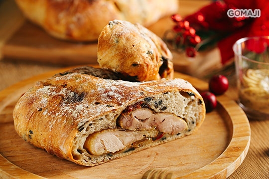 法國坎城歡樂繽紛烤全雞麵包同樣選用台灣黃金雞,在雞隻的腹腔中填入芥末籽、紅椒、青椒、洋蔥、大蒜、起司和普羅旺斯香料等,先烤到9分熟再包裹法國麵糰中。而外層的黑橄欖麵包則是嚴選頂級VIRON麵粉,高級的麵粉製作卻堅持不加價,造就人人讚不絕口的Q彈口感!