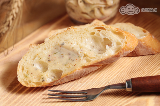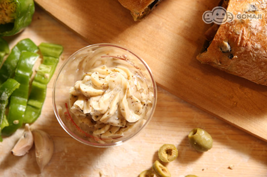 品嚐地中海蕃茄烤雞腿麵包時,除了單吃感受純粹滋味之外,千萬不能錯過畫龍點睛的芥末籽醬,採用蛋、芥末籽醬、普羅旺斯香料、紅酒醋、香蒜粉、黑胡椒、鹽、沙拉油等製作的醬料,風味濃厚,酸香帶些蒜味,讓麵包變得更滑順,別有一番風味喔!