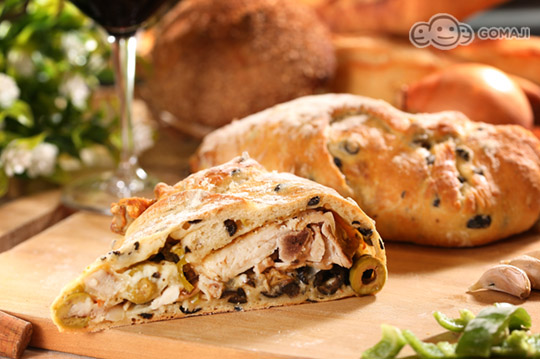 地中海蕃茄烤雞腿麵包特別選用黃金雞腿、麵糰內裹入了芥末籽、紅椒、青椒、大蒜、起司、義大利風乾蕃茄和普羅旺斯香料等,先烤到9分熟再包入法國麵糰中。而外層的法國麵包則是使用VIRON麵粉,高級的麵粉製作卻不加價,造就人人讚不絕口的麵包口感!