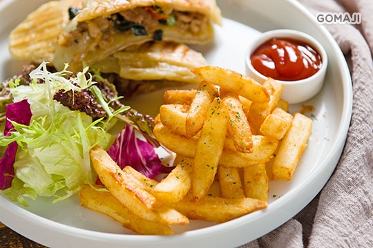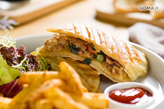 泰式打拋牛肉搭配外層金黃酥香的帕尼尼,一上桌誰能抵擋得住?紮實美味大口享用,鮮香氣息瞬間綻放,三兩下就掃個精光!