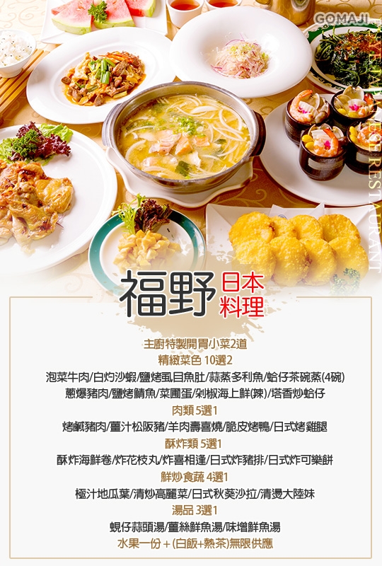 【福野日本料理】重金聘請資深大廚,以精湛的刀工與美感,庖製出入口即化的鮮味,讓饕客能享用精緻日式料理以及美味港式珍饌。同時擅長多國料理的主廚非常會「找食材」,結合廚藝創作其它餐廳不易吃到的菜餚,故能在宴會與大型餐廳市場一支獨秀、獨領風騷多年不墜。這回只要1388元即可讓麻吉輕鬆品味四人超值合菜 !