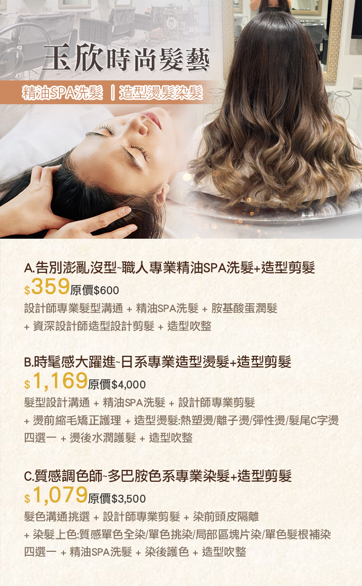 A.告別澎亂沒型~職人專業精油SPA洗髮+造型剪髮 / B.時髦感大躍進~日系專業造型燙髮+造型剪髮 / C.質感調色師~多巴胺色系專業染髮+造型剪髮