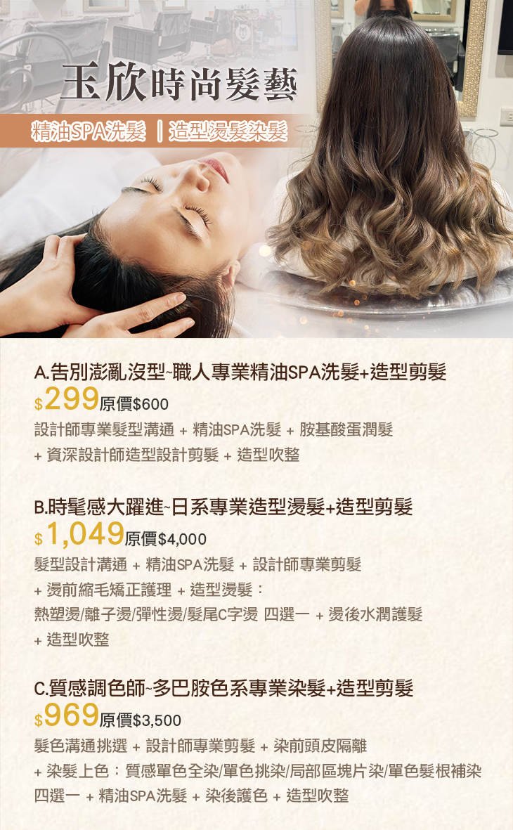 A.告別澎亂沒型~職人專業精油SPA洗髮+造型剪髮 / B.時髦感大躍進~日系專業造型燙髮+造型剪髮 / C.質感調色師~多巴胺色系專業染髮+造型剪髮