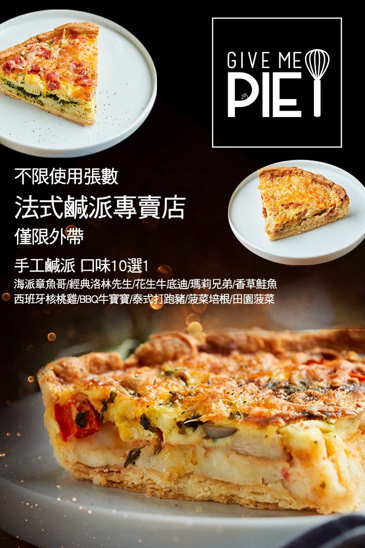 ✎烹烤得金黃酥脆,有如皇冠一般的派皮,搭配創意無國界的新潮內餡,無論哪一款鹹派,都是【GIVE ME PIE】經過不斷嘗試,精心製成的招牌,樣樣都是必吃的口味!