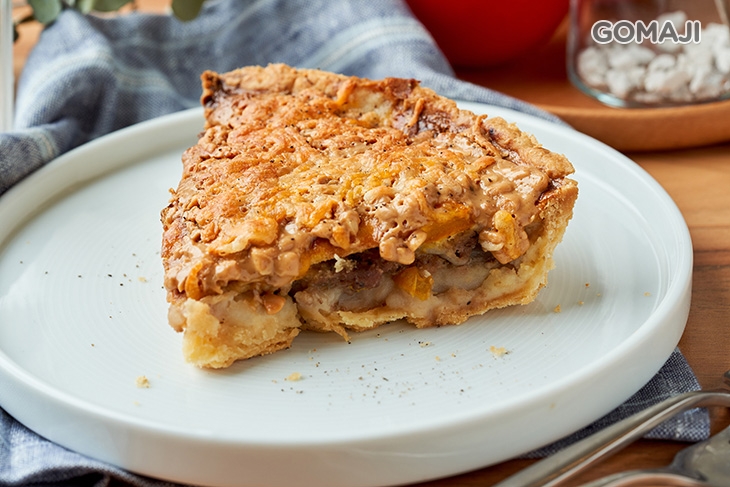 香濃花生與牛肉共譜而成的甜鹹組合,經典且令人難忘!放入使用法國進口奶油製成的派皮中細細烹考,讓滿滿塗抹在派上的花生醬烤上些許焦香色澤,用刀叉取一口細細品味,花生醬濃郁的香氣和牛肉噴香多汁的肉香一拍即合,有如黃金搭檔般的絕品美味,和嚴謹製作、層層酥香的派皮恰好相搭,豪爽又不失精緻的風味,讓人愛不釋口!