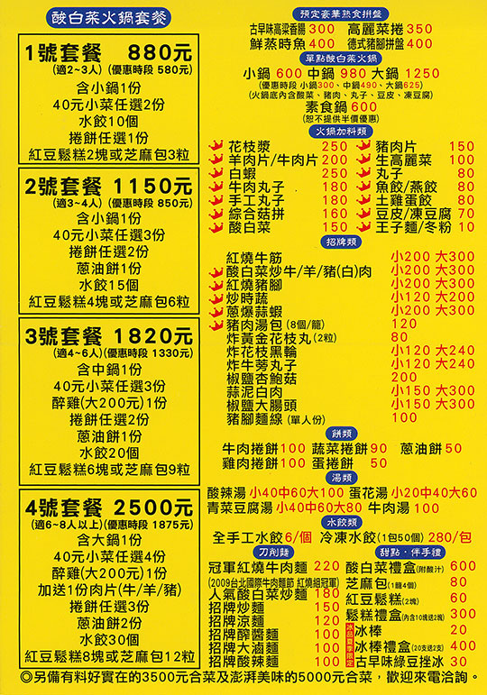 特別推薦:酸白菜火鍋(內含酸菜+豬肉+丸子+豆皮+凍豆腐)、酸白菜炒肉、蔥爆蒜蝦、牛肉捲餅、蔥油餅、醉雞、紅豆鬆糕、全手工水餃、冠軍紅燒牛肉麵、各式小菜等