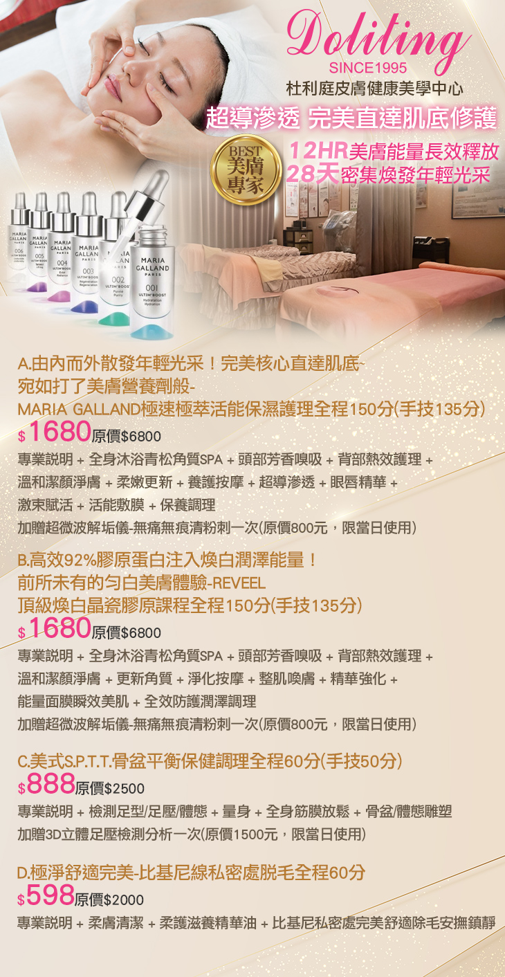 A.由內而外散發年輕光采!完美核心直達肌底~宛如打了美膚營養劑般-MARIA GALLAND極速極萃活能保濕護理全程150分(手技135分) / B.高效92%膠原蛋白注入煥白潤澤能量!前所未有的勻白美膚體驗-REVEEL頂級煥白晶瓷膠原課程全程150分(手技135分) / C.美式S.P.T.T.骨盆平衡保健調理全程60分(手技50分) / D.極淨舒適完美-比基尼線私密處脫毛全程60分