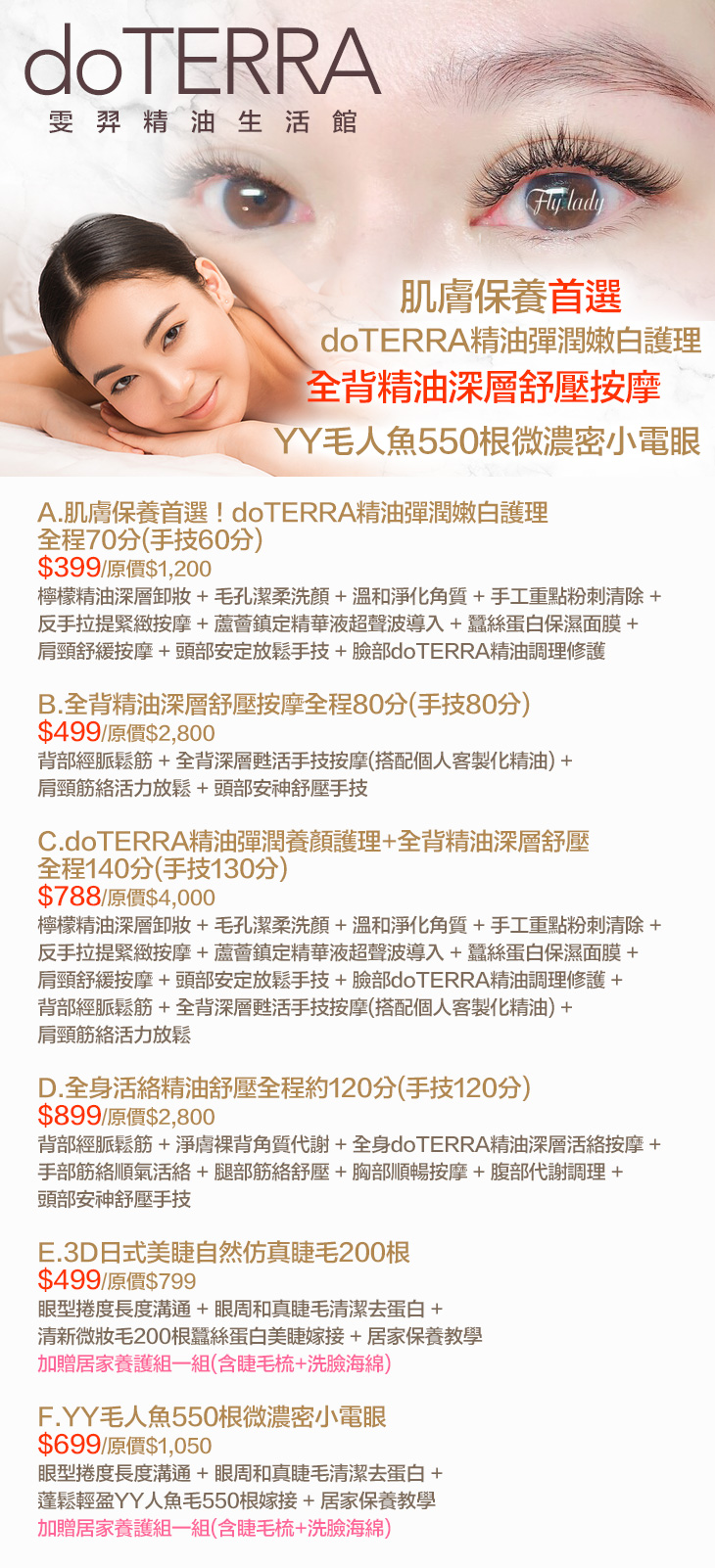 A.肌膚保養首選!doTERRA精油彈潤嫩白護理全程70分(手技60分) / B.全背精油深層舒壓按摩全程80分(手技80分) / C.doTERRA精油彈潤養顏護理+全背精油深層舒壓全程140分(手技130分) / D.全身活絡精油舒壓全程約120分(手技120分) / E.3D日式美睫自然仿真睫毛200根 / F.YY毛人魚550根微濃密小電眼