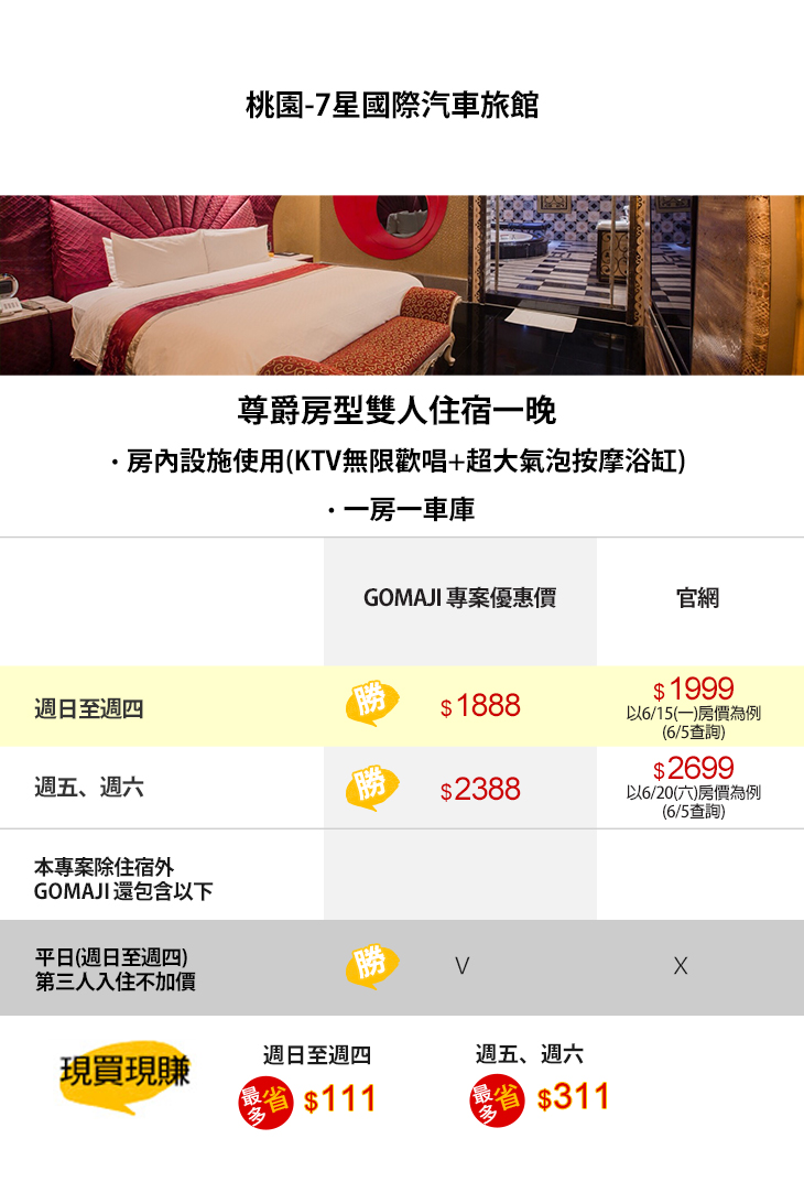 【桃園-7星國際汽車旅館】感謝麻吉們熱烈搶購,已全數賣光光。