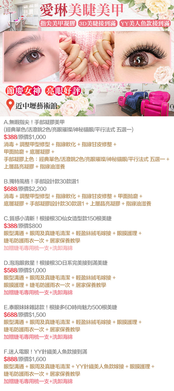 A.無暇指尖!手部凝膠美甲(經典單色/活潑跳2色/亮眼璀璨/神秘貓眼/平行法式 五選一) / B.獨特風格!手部設計款30款選1 / C.質感小清新!根接根3D仙女造型款150根美睫 / D.泡泡眼救星!根接根3D日系完美接到滿美睫 / E.泰眼妹妹雜誌款!根接多6D時尚魅力500根美睫 / F.迷人電眼!YY針織美人魚款接到滿