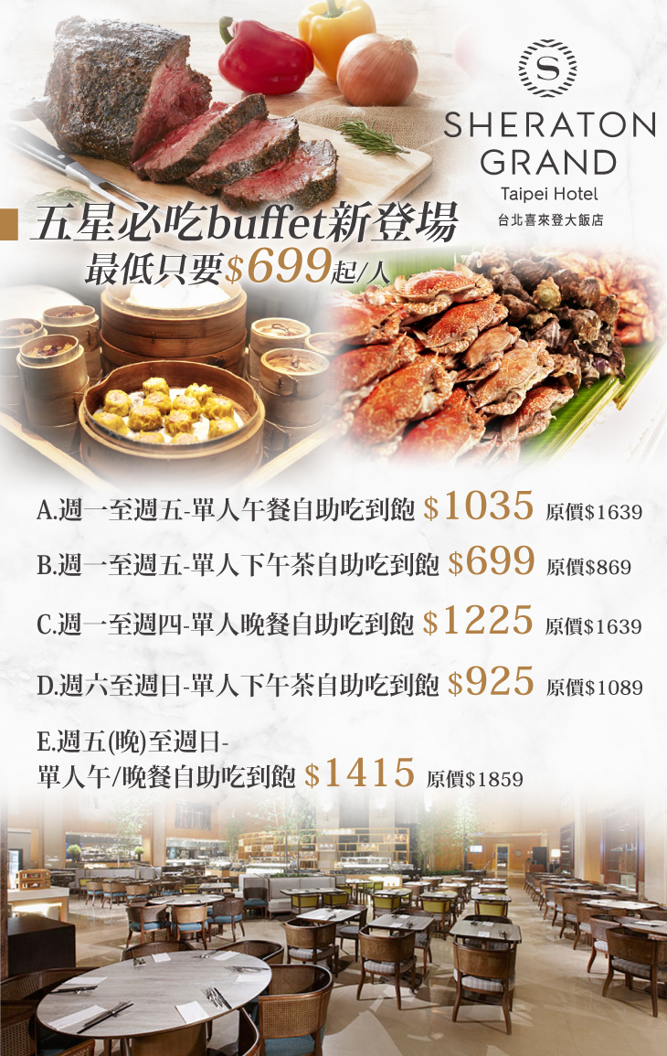 五星必吃buffet新登場!A.週一至週五-單人午餐自助吃到飽 / B.週一至週五-單人下午茶自助吃到飽 / C.週一至週四-單人晚餐自助吃到飽 / D.週六至週日-單人下午茶自助吃到飽 / E.週五(晚)至週日-單人午/晚餐自助吃到飽