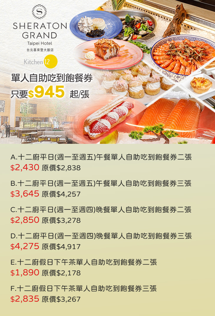 ★★★ 十二廚-平日午餐單人/十二廚-平日晚餐單人/十二廚-假日下午茶單人自助吃到飽餐券 ★★★