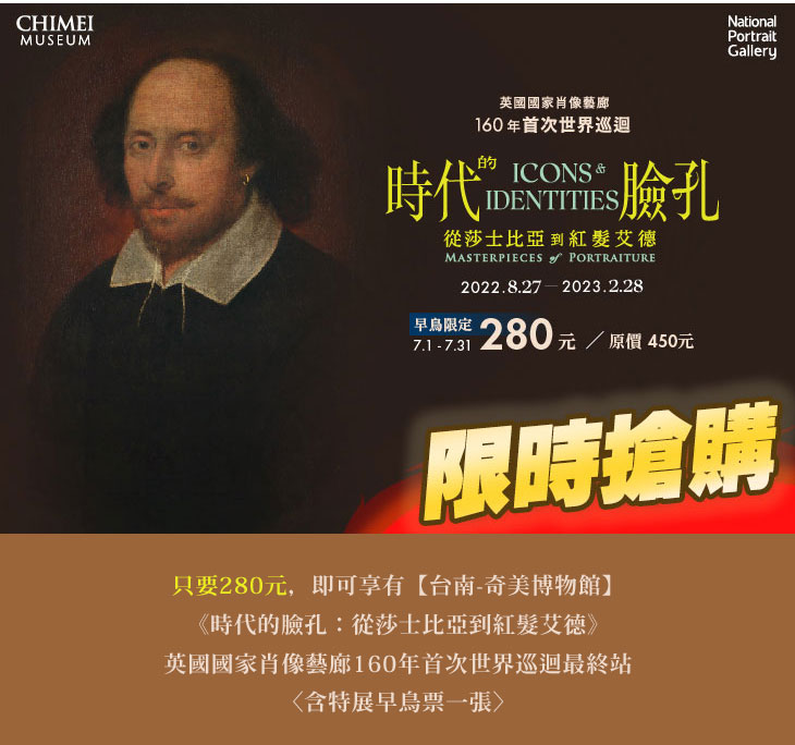 《時代的臉孔:從莎士比亞到紅髮艾德》是英國國家肖像藝廊160多年來的首次大規模世界巡迴,被譽為「一生僅有一次遇上的機會」!大批從未離開英國國土的國寶級作品,匯聚台南奇美博物館登場。本展為奇美博物館30週年特別獻禮,邀請大家一同飽覽跨越500年的時代名人之生命歷程,看見他們如何發揮力量影響英國、豐富世界。