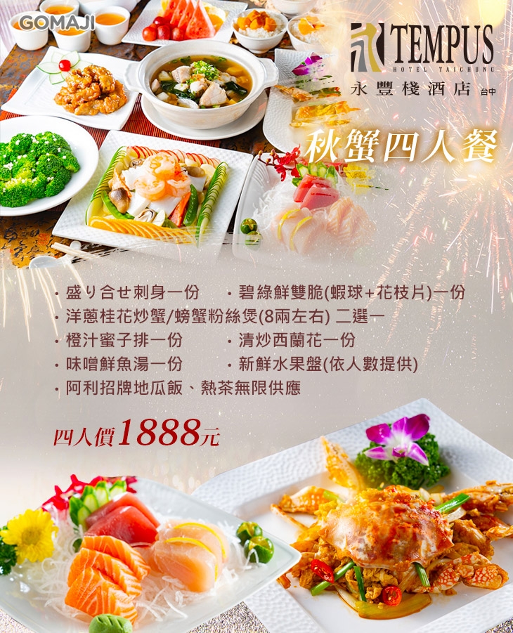 熱愛吃蟹的麻吉們有口福了!秋蟹四人餐,讓您享受新鮮海味襲捲而來的美味,料多新鮮,絕對吃飽飽,還有飯後新鮮水果盤,飽餐一頓後繼續沉浸相談甚歡的愉悅,讓一行人滿載而歸,擁有無限滿足!