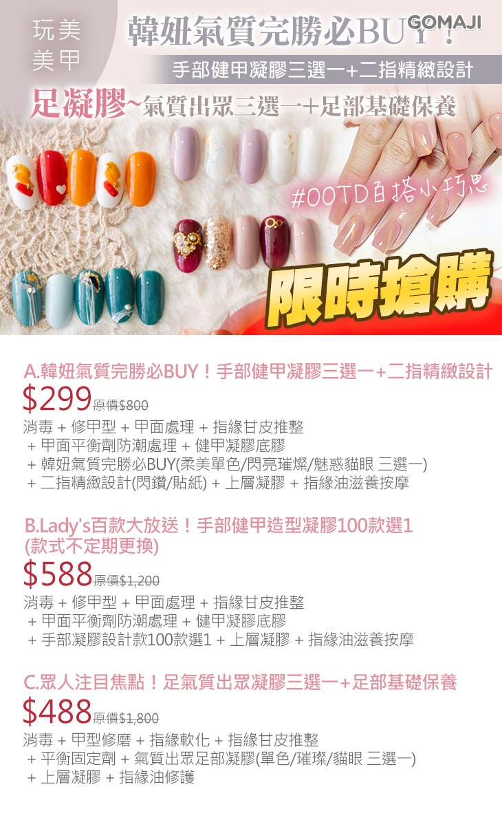 A.韓妞氣質完勝必BUY!手部健甲凝膠三選一+二指精緻設計 / B.Lady's百款大放送!手部健甲造型凝膠100款選1(款式不定期更換) / C.眾人注目焦點!足氣質出眾凝膠三選一+足部基礎保養