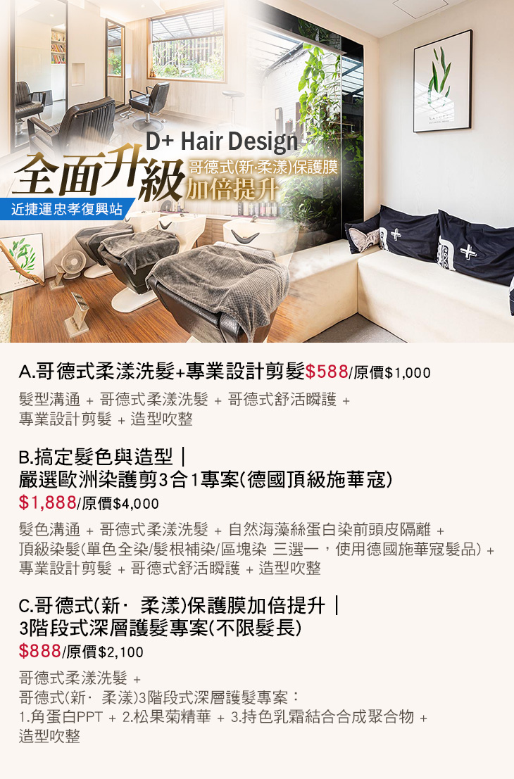 A.哥德式柔漾洗髮+專業設計剪髮 / B.搞定髮色與造型|嚴選歐洲染護剪3合1專案(德國頂級施華寇) / C.哥德式(新·柔漾)保護膜加倍提升|3階段式深層護髮專案(不限髮長)
