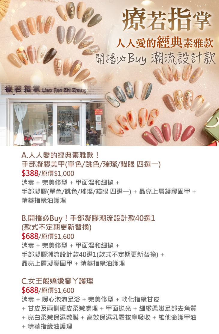 A.人人愛的經典素雅款!手部凝膠美甲(單色/跳色/璀璨/貓眼 四選一) / B.開播必Buy!手部凝膠潮流設計款40選1(款式不定期更新替換) / C.女王般嬌嫩腳丫護理