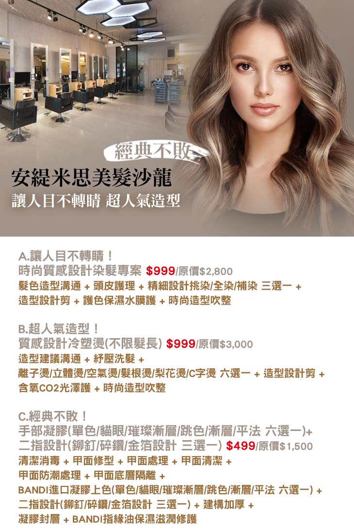 A.讓人目不轉睛!時尚質感設計染髮專案 / B.超人氣造型!質感設計冷塑燙(不限髮長) / C.經典不敗!手部凝膠(單色/貓眼/璀璨漸層/跳色/漸層/平法 六選一)+二指設計(鉚釘/碎鑽/金箔設計 三選一)