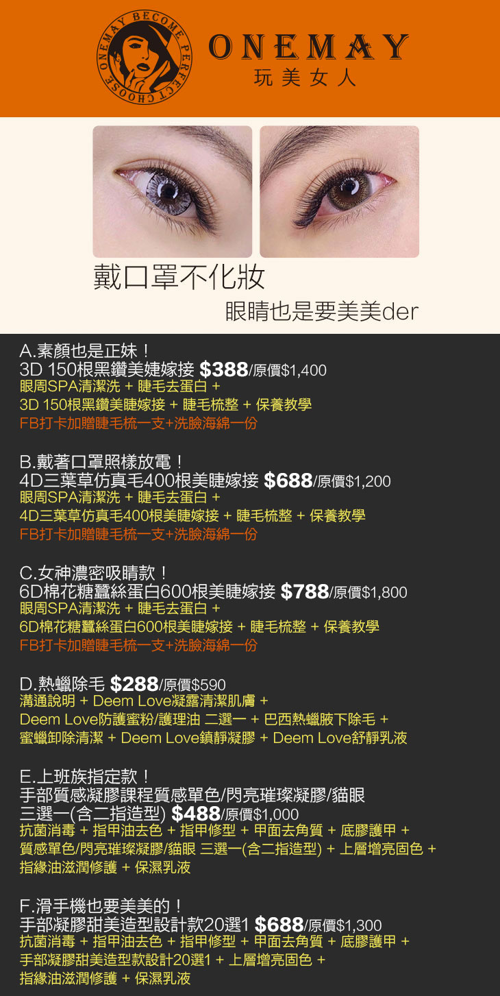 A.素顏也是正妹!3D 150根黑鑽美婕嫁接 / B.戴著口罩照樣放電!4D三葉草仿真毛400根美睫嫁接 / C.女神濃密吸睛款!6D棉花糖蠶絲蛋白600根美睫嫁接 / D.熱蠟除毛 / E.上班族指定款!手部質感凝膠課程質感單色/閃亮璀璨凝膠/貓眼 三選一(含二指造型) / F.滑手機也要美美的!手部凝膠甜美造型設計款20選1