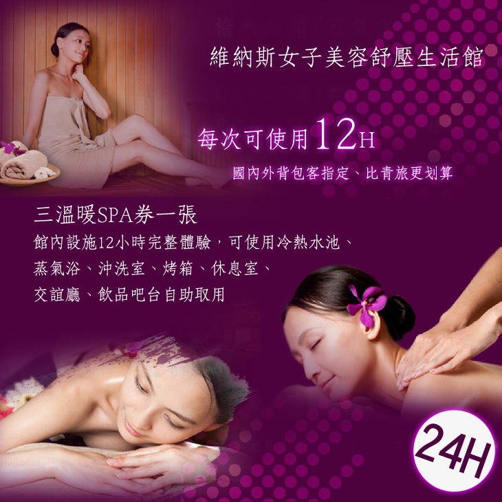 含館內設施12小時完整體驗,可使用冷熱水池、蒸氣浴、沖洗室、烤箱、休息室、交誼廳、飲品吧台自助取用