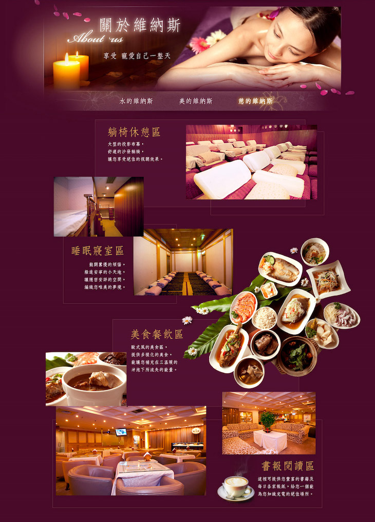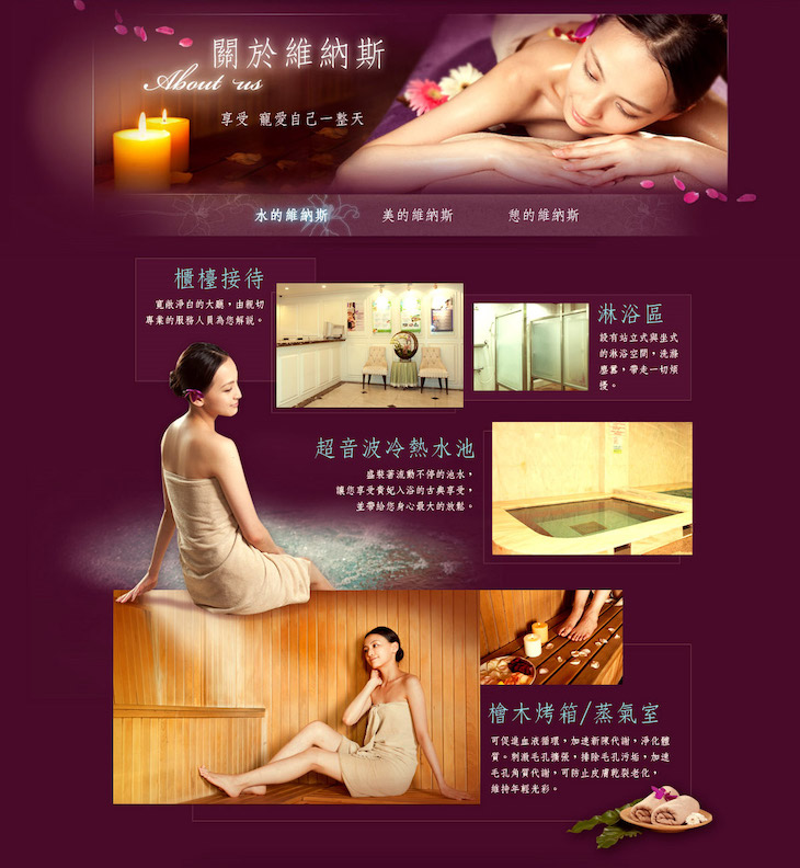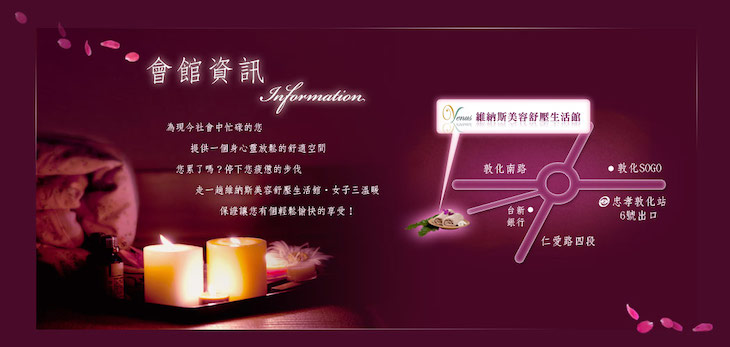 近捷運忠孝敦化站、敦南誠品!重金打造專業的美容舒壓會館,館內設有冷熱水池、蒸氣浴、沖洗室、烤箱、休息室、交誼廳等設施,歐式宮廷風的奢華裝潢,讓您在優美的環境圍繞中,盡享忙碌生活中的片刻休憩,維納斯用心寵愛每一位愛美女性,讓您朝女神形象更近一步!